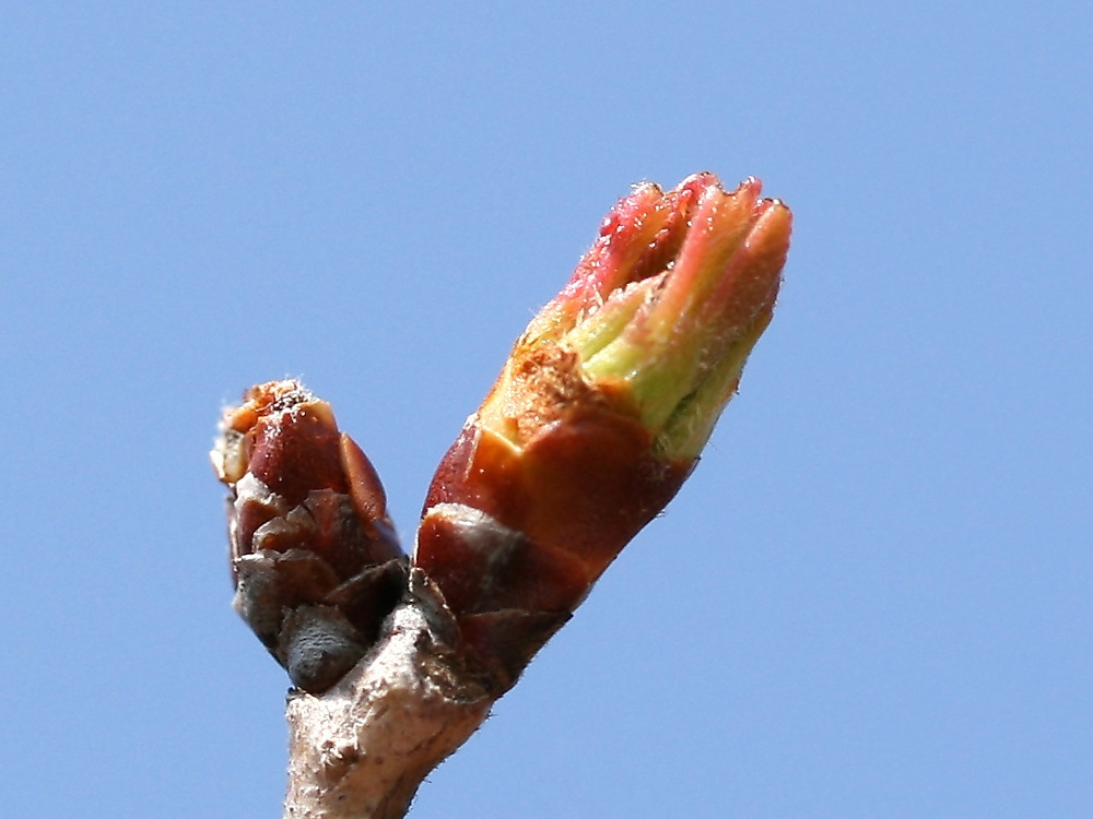 MEMO: 膨らみが増した十月桜の冬芽で、先端が割れ、 葉らしきものが出てきたところ
