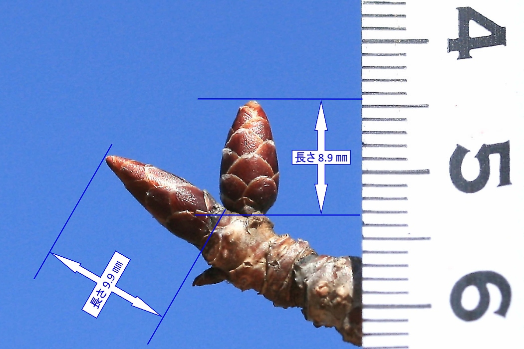 MEMO: 朱雀の冬芽で、円錐形および長卵形で、長さ 8.9 ~ 9.9 ㎜と長い 品種であり、開花時期は4月中旬~下旬であるため、まだまだ堅い状態である
