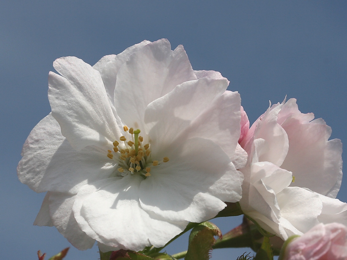 MEMO: 開花したばかりの朱雀で、半八重の大輪で花が重いため、 ほとんど下垂して咲き、下から見上げると見ごたえがある