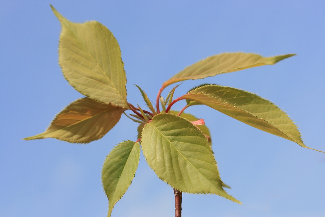 MEMO: 葉が出た朱雀で、満開頃から大きめの緑色がかった茶色の若葉が出始める