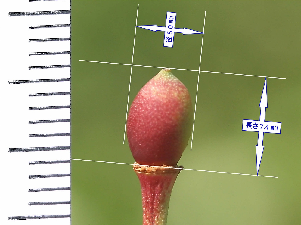 MEMO: 朱雀の実の長さで、長さが11日前の 6.8 ㎜から 7.4 ㎜と 僅かに大きくなっているが、この大きさでもう赤くなってきており、 この先、熟すところまで成長する前に落果してしまうと思われる