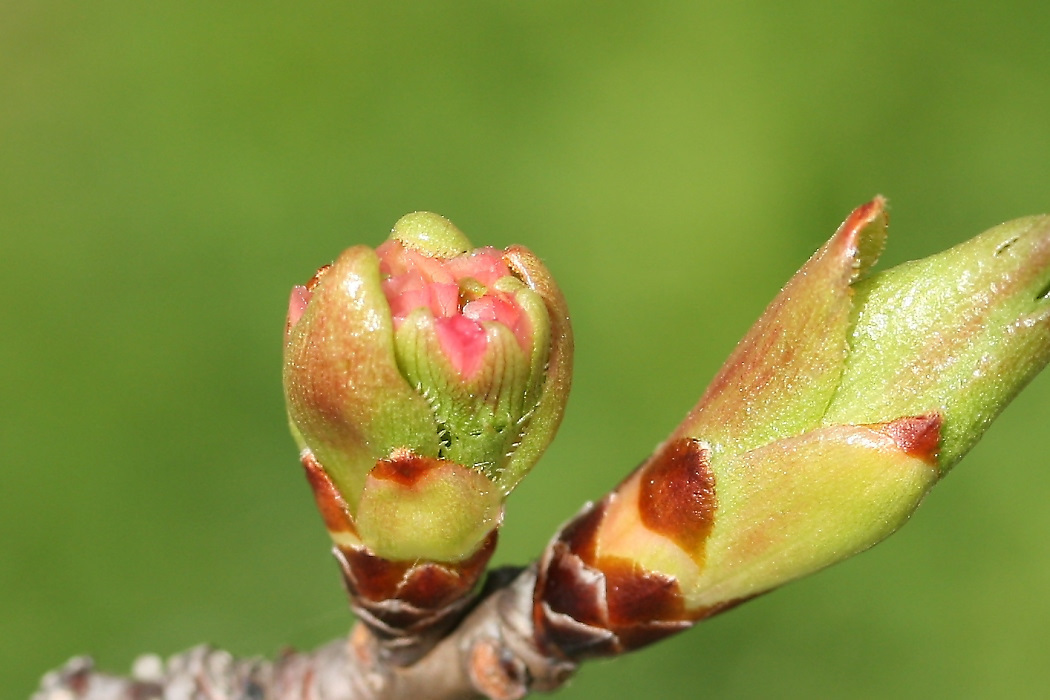 MEMO: 蕾が出始めた松月で、先端が割れ、 やや薄目の紅色の花弁の中心に雌しべも見えている