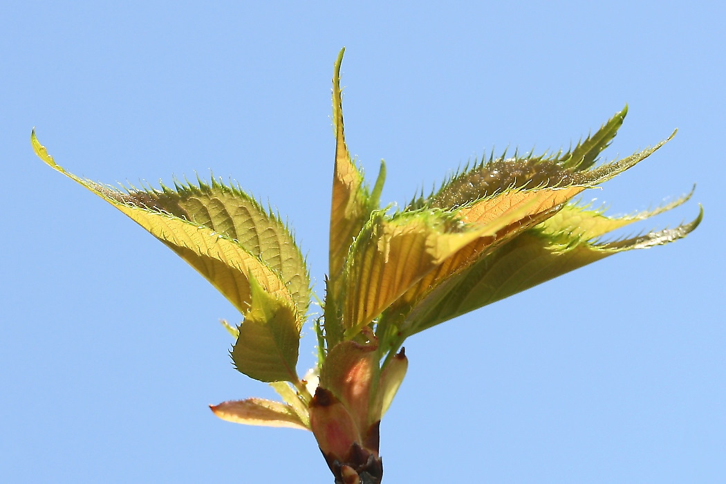 MEMO: 葉が出始めた松月で、開花と同時に茶色がかった黄緑色の若葉が出る