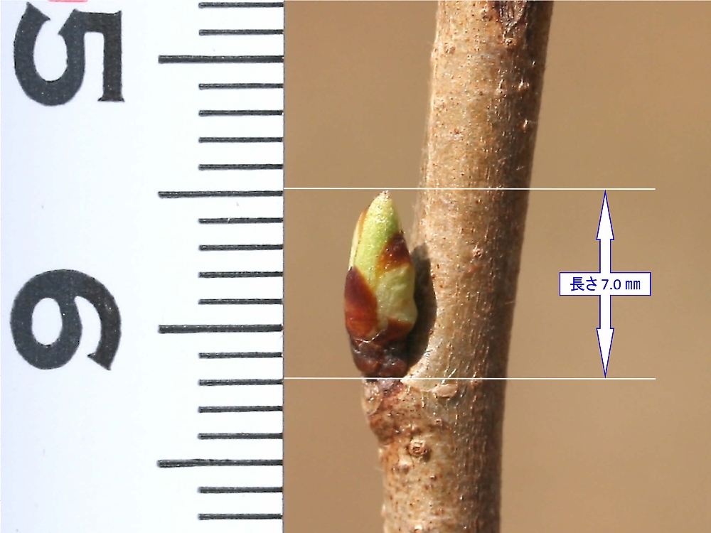MEMO: 神代曙の冬芽で、円錐形で、長さが 7.0 ㎜と長くなってきたが、 それでもまだまだ小さく、この芽が花芽か葉芽かは全く区別がつかない