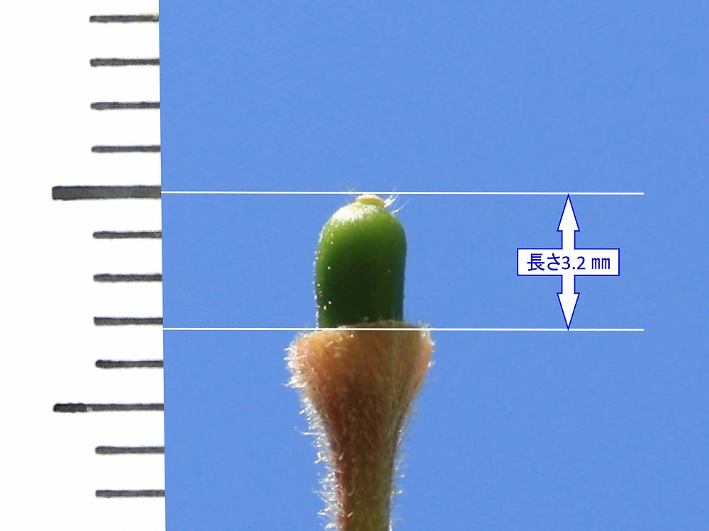 MEMO: 結実したばかりの神代曙の実の長さで、3.2 ㎜と とても小さく可愛い実で、太さは約 2 ㎜ほどである