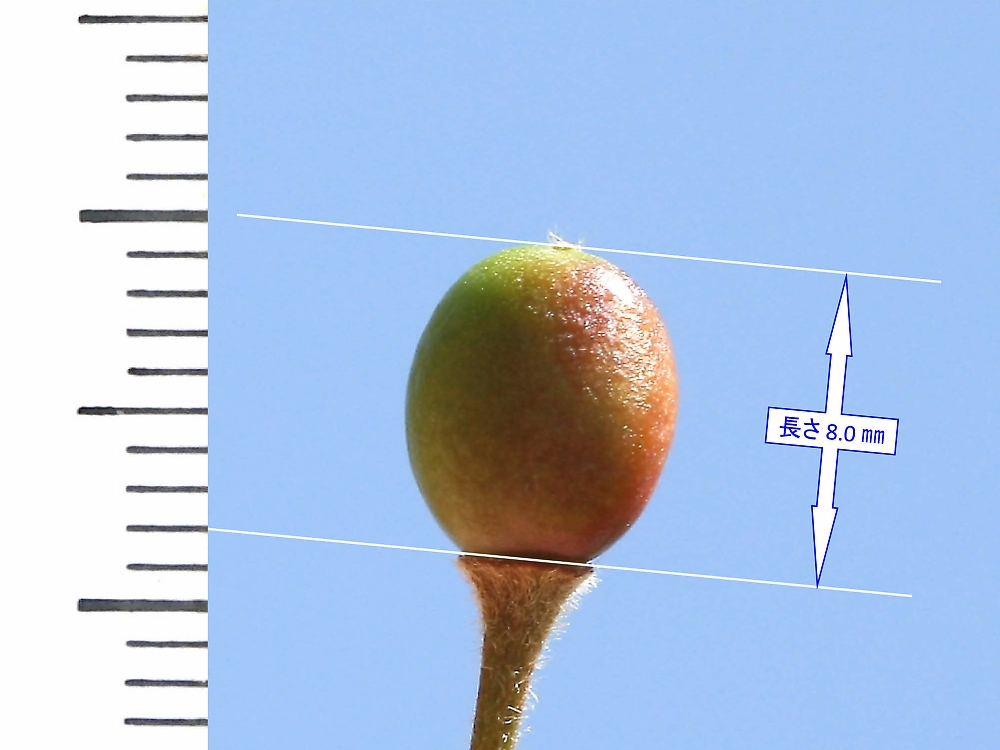 MEMO: 神代曙の実の長さで、長さ 8.0 ㎜と普通からやや大きめの実で、 整った卵形で暗紅色が付き始めたところで、今後の成長が楽しみなところ