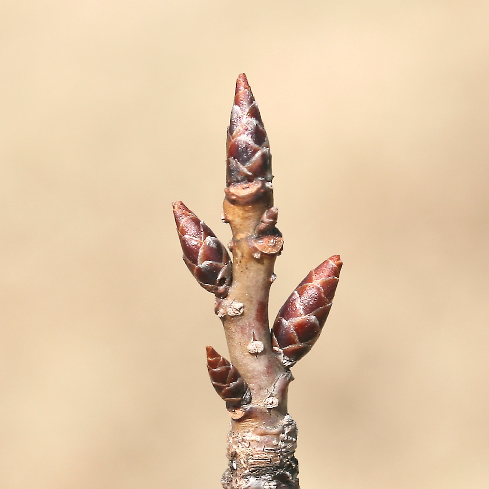 MEMO: 膨らみ始めた須磨浦普賢象の冬芽で、先端が割れ、 先端にかすかに淡紅色や淡黄緑色が見え始めてきたところ