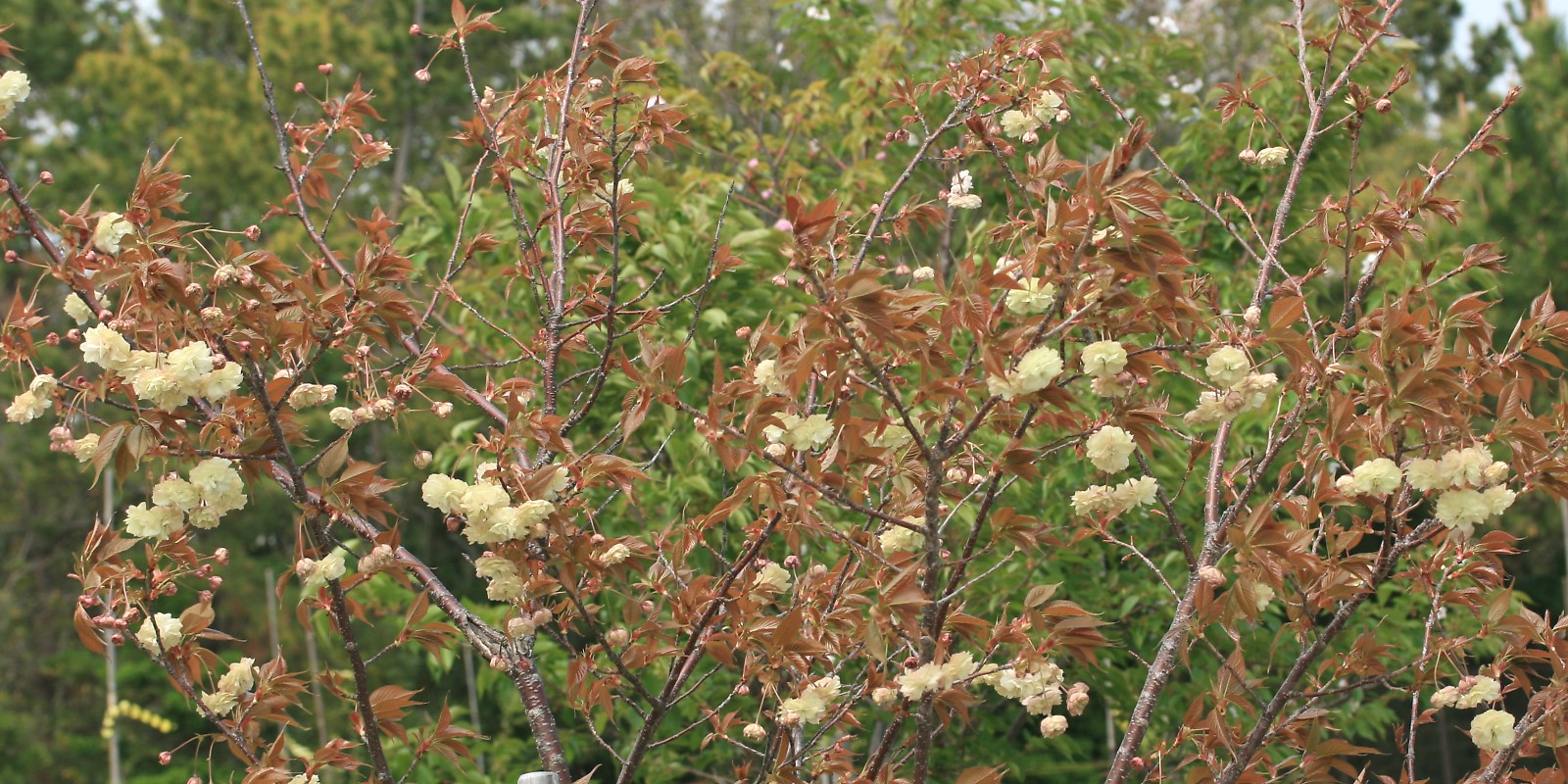 MEMO: 5分咲きの須磨浦普賢象で、黄緑色の八重の中輪で花が重いため、 ほとんどの花が下垂して咲き、下から見上げてみないと綺麗に見えない