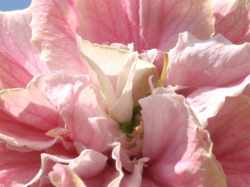MEMO: 須磨浦普賢象の花の中心を拡大したもので、花の中心の緑色の 葉化雌しべの中から白っぽい2枚の花弁が出てきたところで、このように 花の中に花が咲くことを二段咲きと言い、これが須磨浦普賢象の最大の特徴である