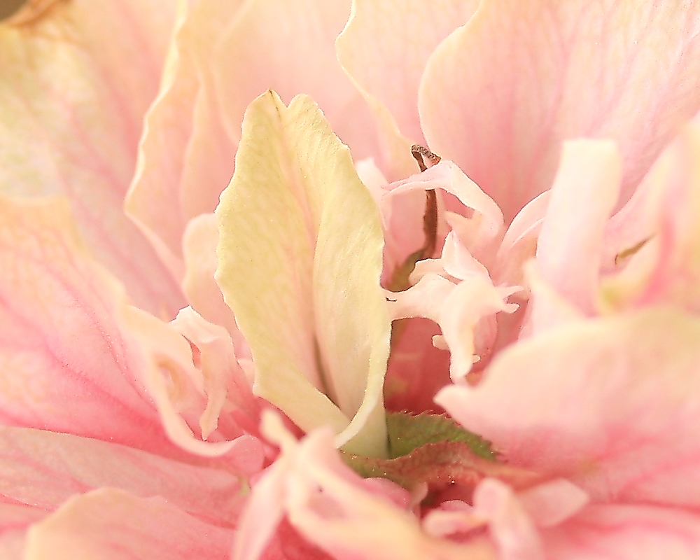 MEMO: 須磨浦普賢象の花の中心を拡大したもので、中心の 葉化雌しべの中から出ている花弁の色が少しだけ黄色味を帯びて いるものが、二段目の花の花弁であり、この先もっと開いてくる
