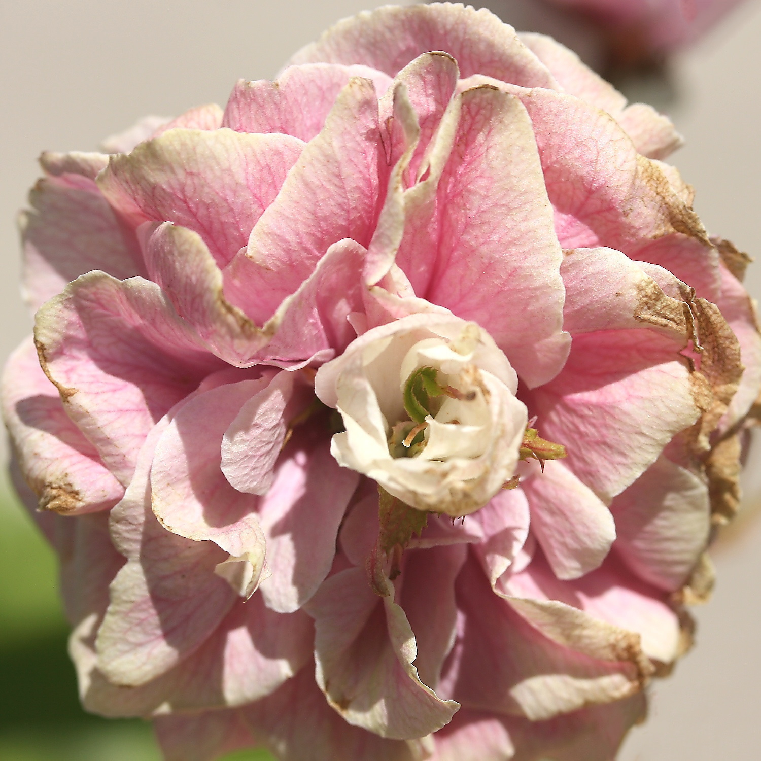 MEMO: 遅れ花の須磨浦普賢象で、花の中心に白っぽい花弁があるが、 二段目の花の花弁でその中に二段目の葉化雌しべが確認できる