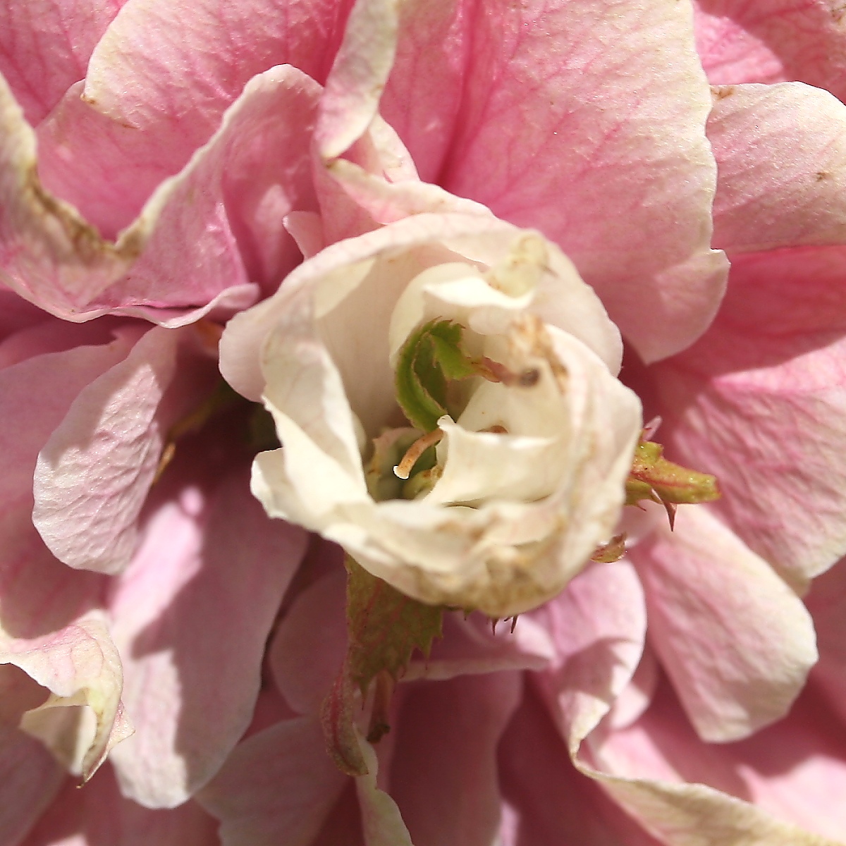 MEMO: 遅れ花の須磨浦普賢象の花の中心を拡大したもので、花の中心に 白っぽい花弁があり、それが二段目の花で、その外に葉化雌しべが3個あり、 二段目の花の中心に二段目の葉化雌しべが確認でき、二段咲きがよくわかる