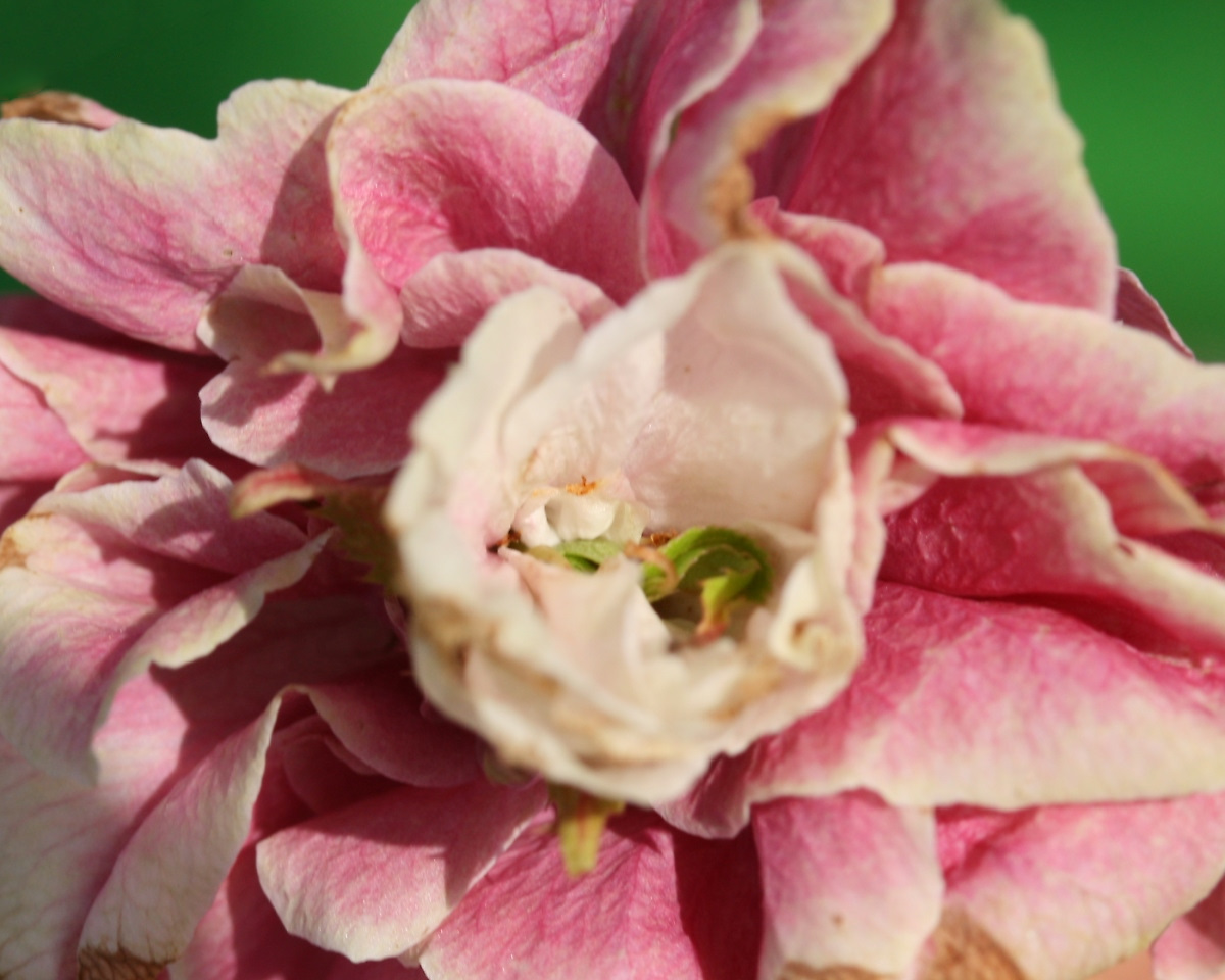 MEMO: 遅れ花の須磨浦普賢象で、花の中心に白っぽい花弁があるが、 二段目の花の花弁でその中に二段目の葉化雌しべが確認できる