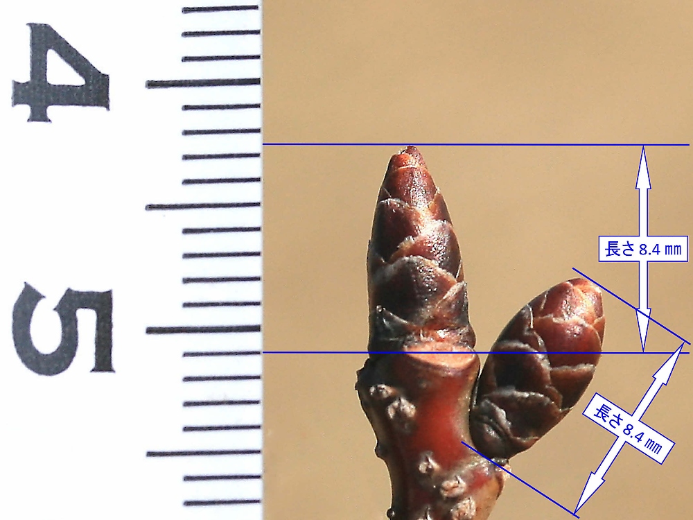 MEMO: 駿河台匂の冬芽で、円錐形および長卵形で、長さ 8.4 ㎜と長い品種 であり、開花時期は4月下旬~5月上旬であるため、まだまだ堅い状態である
