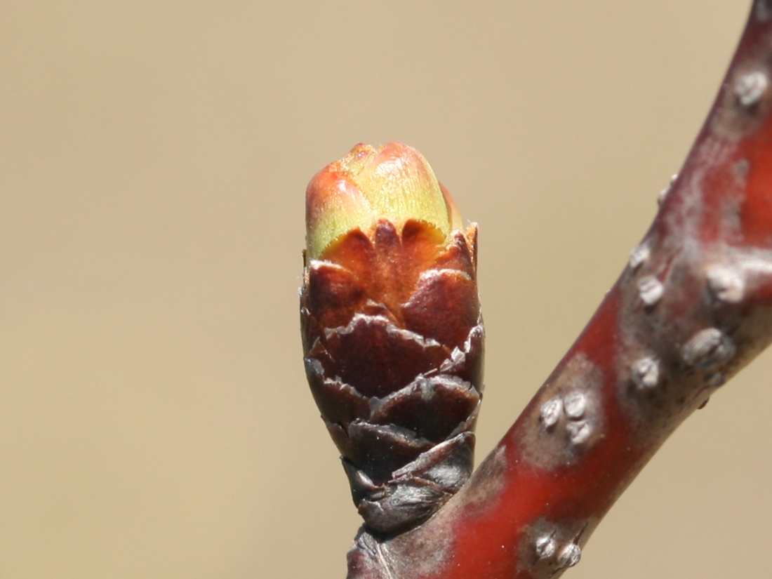 MEMO: 膨らみが更に増した駿河台匂の冬芽で、先端の淡紅色 や淡黄緑色部分が伸び、まもなくつぼみや葉が出始めるところ