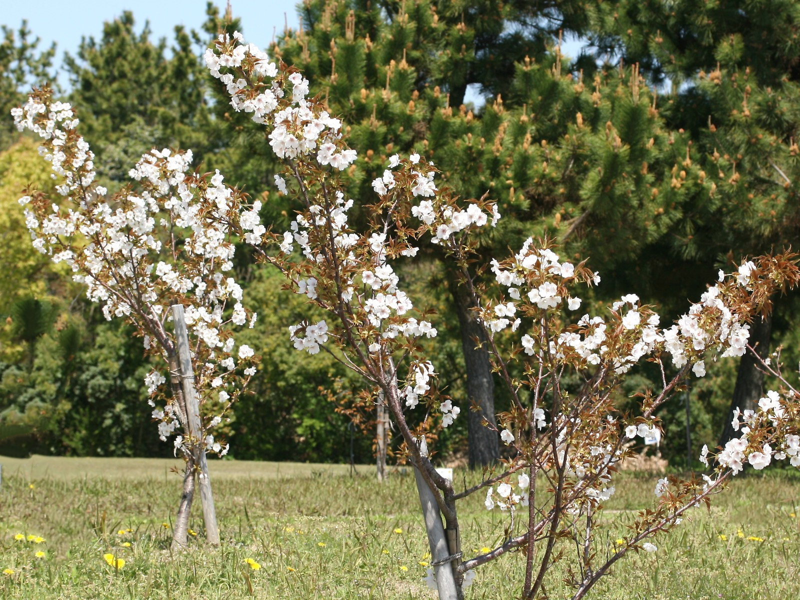 MEMO: 満開時期を迎えた駿河台匂で、若木のため木全体に花は付いておらず、 更に葉も開き始めており、あまり豪華さは無いが、唯一の芳香のある品種である