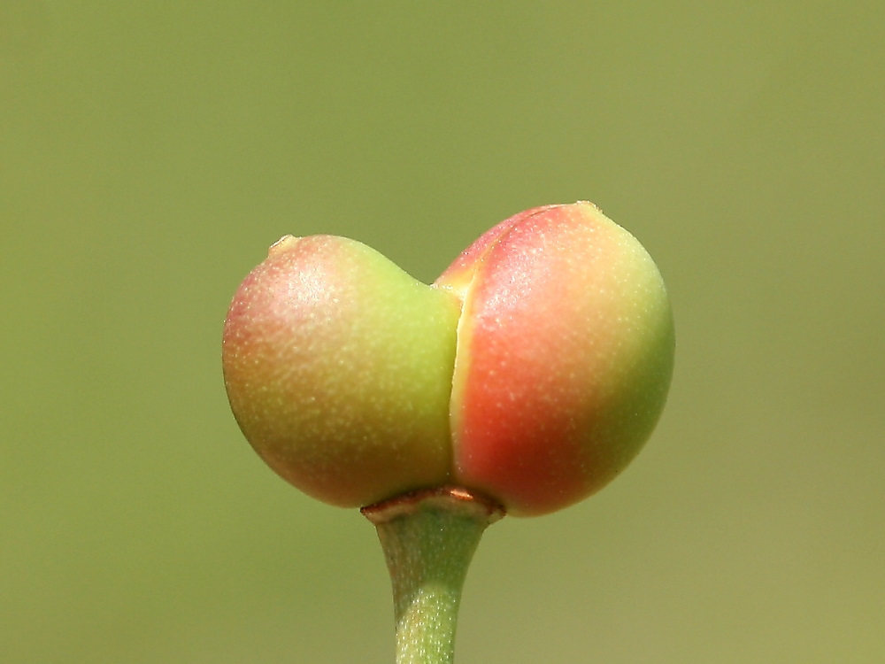 MEMO: 駿河台匂の実で、駿河台匂としては初めて見る双子の実で、 色も赤みを帯びてきており、完熟するまでこの姿でいるか見ものである