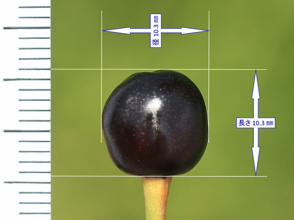 MEMO: 完熟した駿河台匂の実の大きさで、長さは 10.3 ㎜で、 径も 10.3 ㎜(長さの100%)で、角ばった球形の完熟した実を見れて嬉しい
