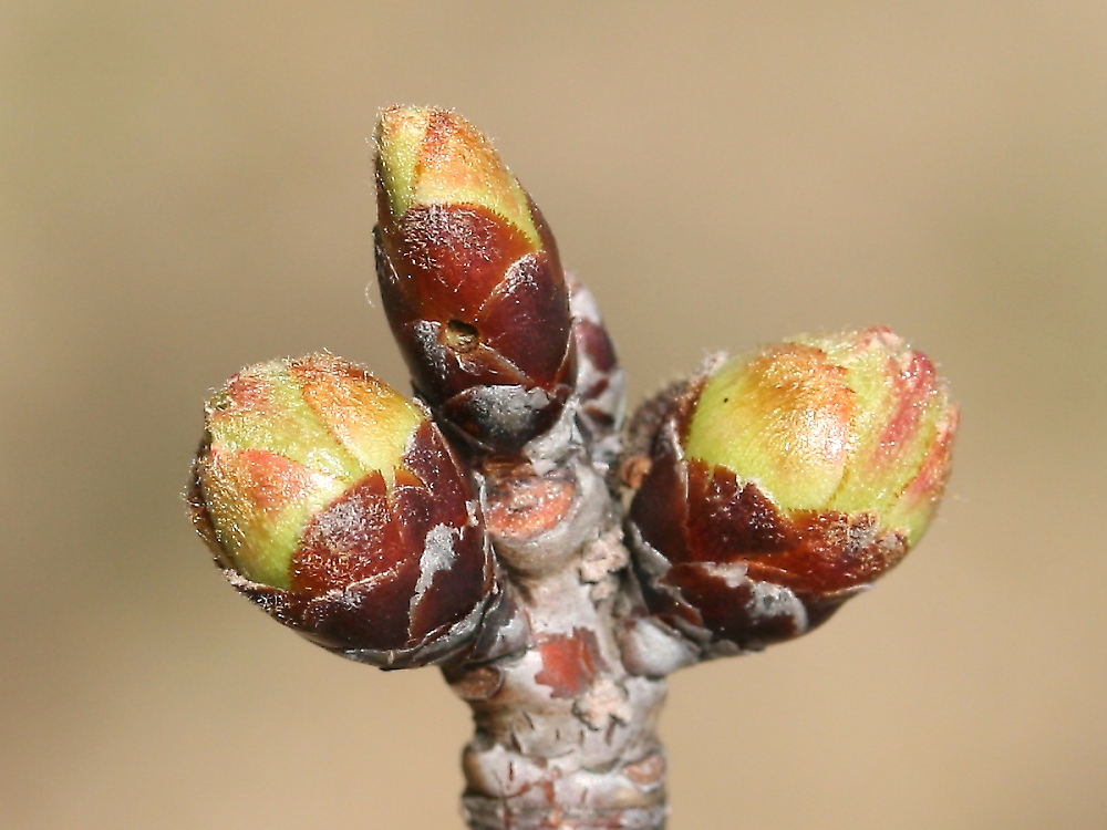 MEMO: 膨らみが最高潮に達した衣通姫の冬芽で、丸々になってきたところで、 先端の淡紅色部が割れ始めてきたところで、まもなくつぼみが出てくると思われる