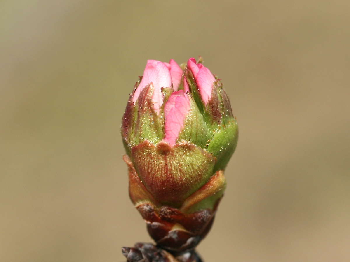 MEMO: 蕾が出始めた衣通姫の冬芽(花芽)で、先端が 割れ、つぼみの中の花弁の淡紅色が見え始めてきたところ