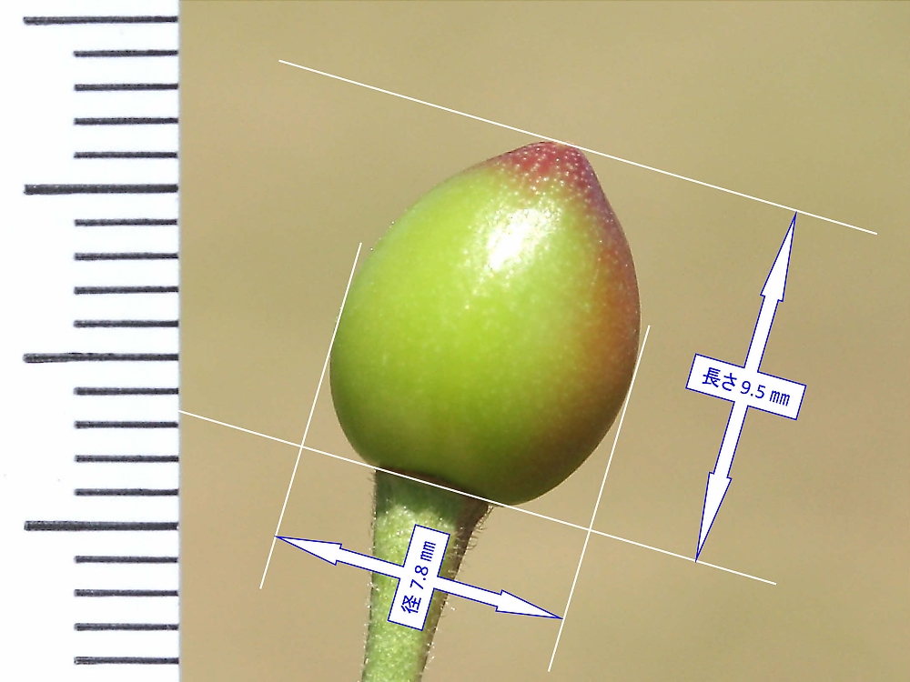 MEMO: 結実した衣通姫の実の長さで、長さ 9.5 ㎜と12日より一回り大きく なってきており、色も濃紅色が付き始め、形も丸くなってきたところ