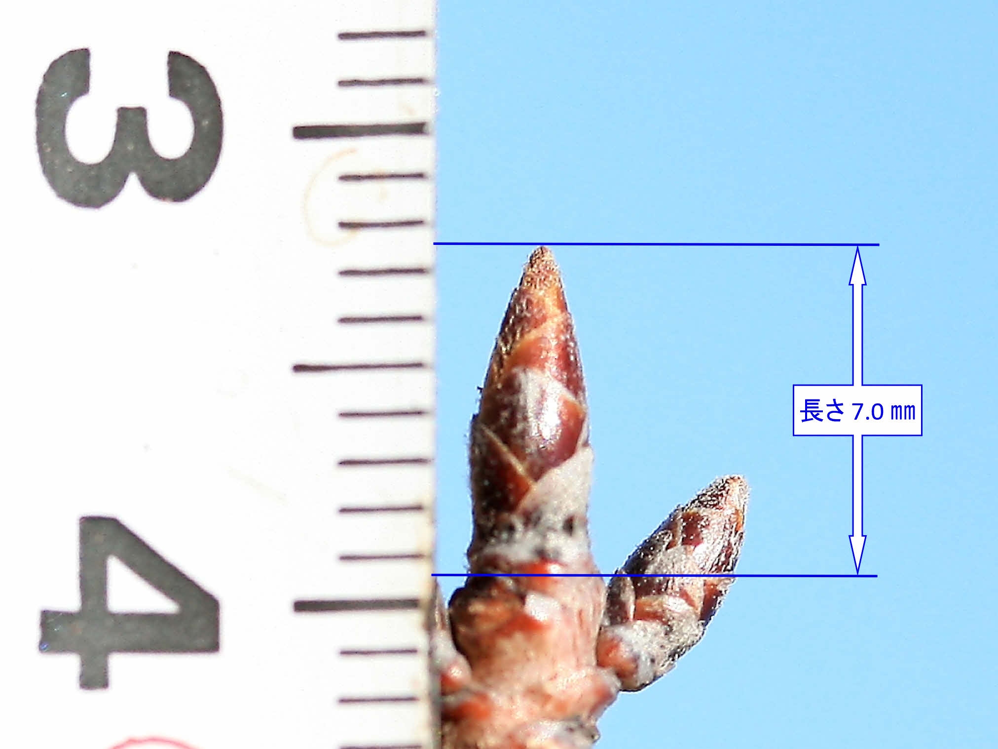 MEMO: 染井吉野の冬芽で、円錐形で、長さ 7.0 ㎜と普通の長さであり、 全体に短毛が有り、開花時期が4月上旬であるため、全く堅い状態である