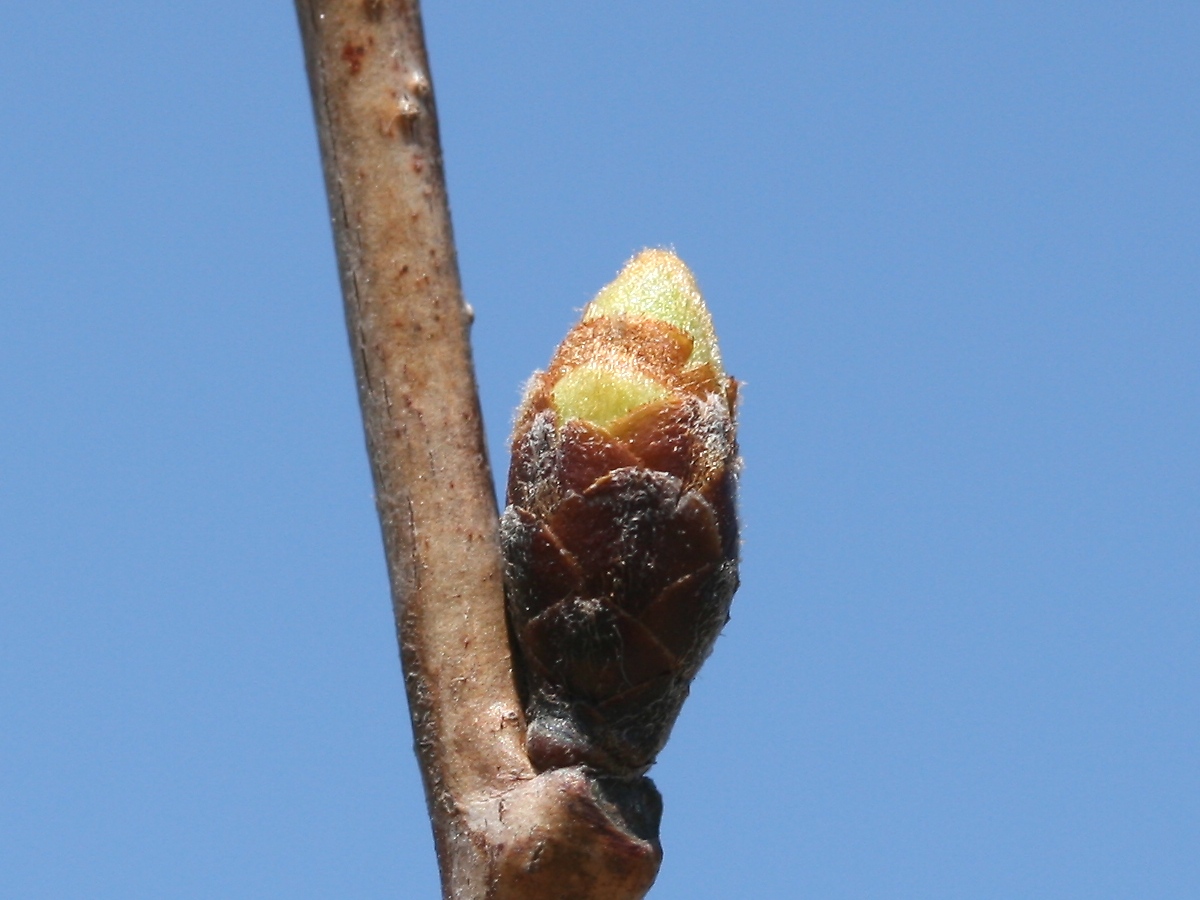 MEMO: 膨らみが増した染井吉野の冬芽で、先端の淡黄緑色が 伸びてきたところで、芽の形から葉枝が出てくる葉芽のようである