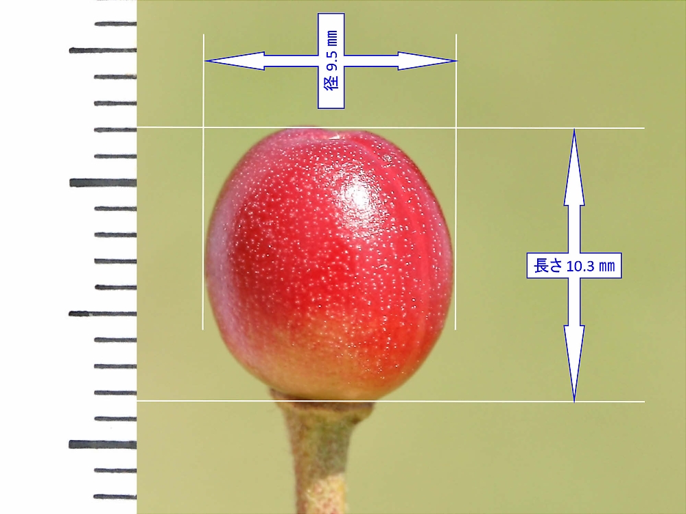 MEMO: 結実した染井吉野の実の長さで、2週間前の 9.6 ㎜から 10.3 ㎜と少し大きくなり、径も 9.5 ㎜(長さの92%)で丸みが増し、 全体が赤くなており熟し中と思われ、どこまで熟すか楽しみである