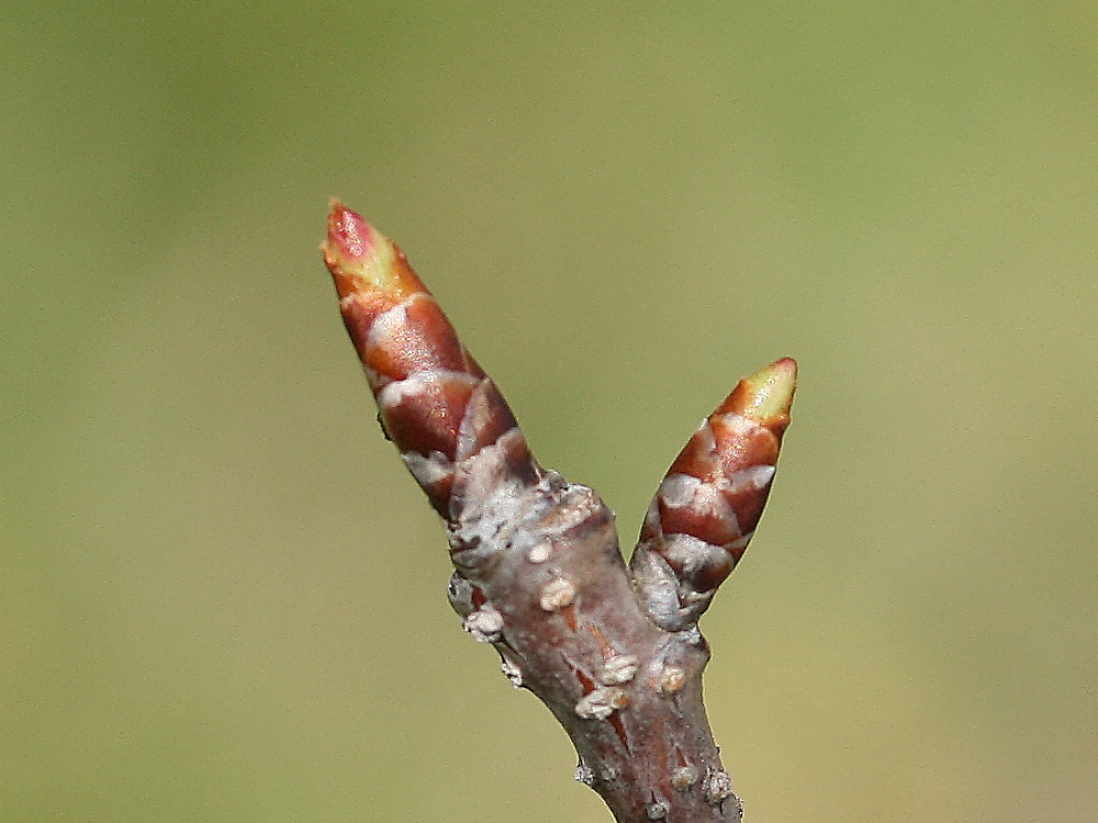 MEMO: 膨らみが増した奈良の八重桜の冬芽で、先端が 割れ、淡紅色や淡黄緑色が見え始めてきたところ
