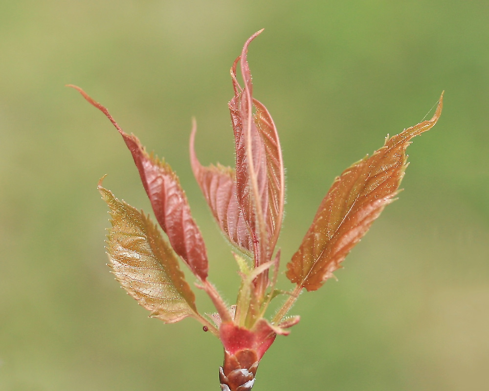 MEMO: 葉が出始めた奈良の八重桜で、つぼみが出るより先に このように褐色の若葉が出始めるのが特徴である