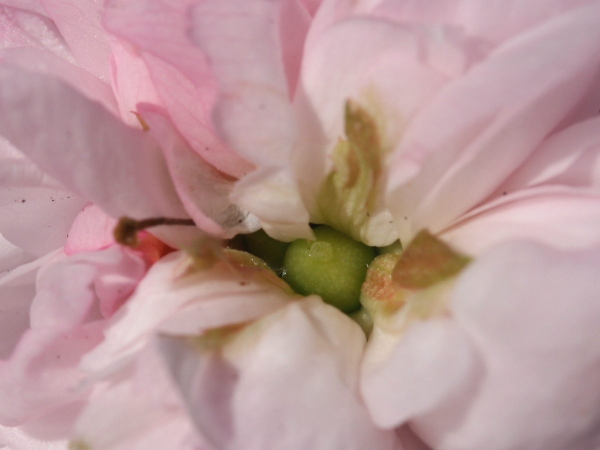 MEMO: 八重咲きの奈良の八重桜の花の中心を拡大したもので、花の 中心に緑色のものが見えるがこれは何でしょうか?、初めて見るもので あり、全く想像もつかないもので、この先どうなるのかが楽しみである