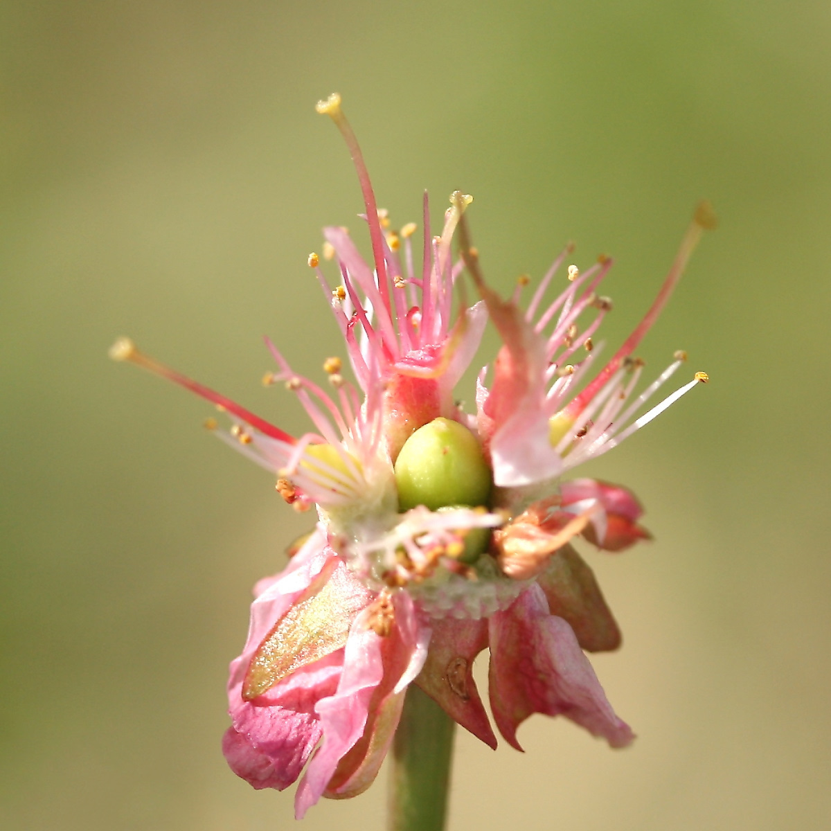 MEMO: 花弁が散った状態の奈良の八重桜で、3個の雌しべの根元に結実直後の 黄色い実が見え、中心には黄緑色の大きな実と思われるものがあり、初めて見る姿 であるが、この姿から花は複数の花が集まって1個の花を形成していると思われる
