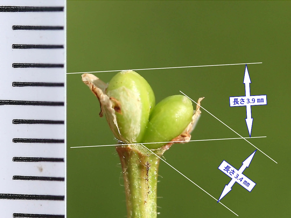 MEMO: 結実したばかりの奈良の八重桜の実の長さで、双子の実は 長さ 3.9 ㎜と 3.4 ㎜で黄緑色の可愛い実である