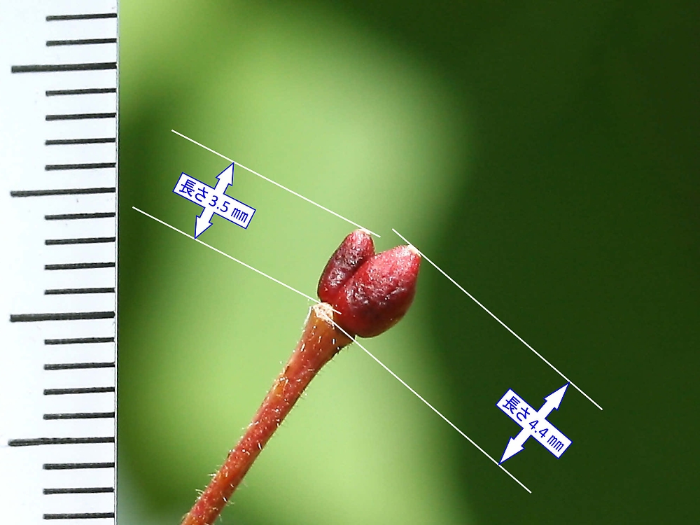 MEMO: 結実した奈良の八重桜の実の長さで、双子の実は長さ 4.4 ㎜と 3.5 ㎜で、実が傷んでおり、おそらく間もなく落果してしまうと思われる