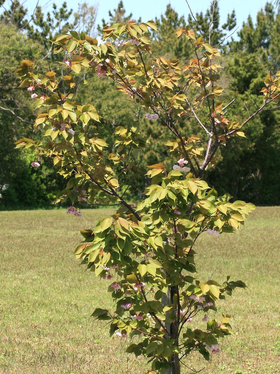 MEMO: 花時期の終りが間近になった普賢象で、茶色の 葉が茂り始め、花もまばらになり、葉桜になりつつある