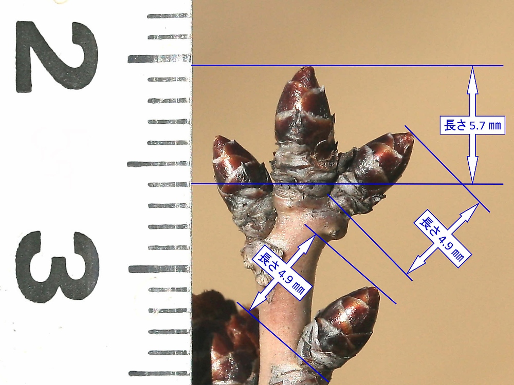 MEMO: 冬桜の冬芽で、長卵形および釣鐘形で、長さ 4.9 ~ 5.7 ㎜と普通の長さ であり、ニ季咲きの春咲きの開花時期は4月であるため、全く堅い状態である