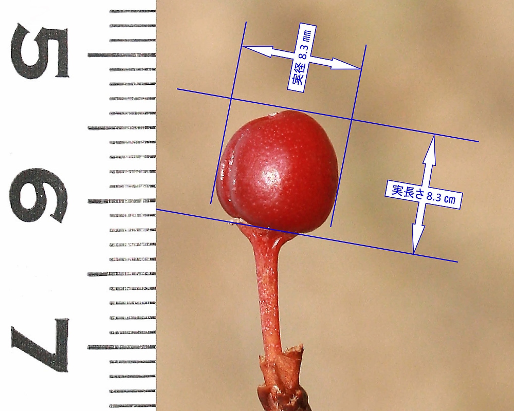 MEMO: ニ季咲き冬桜の秋咲きの果実で、球形で、大きさ 8.3 × 8.3 ㎜、 赤熟した状態で、表面は僅かに凹凸が有り、縦に溝があるのが特徴である