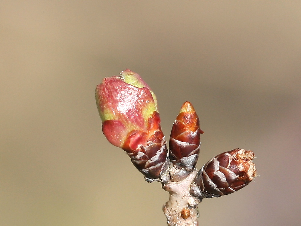 MEMO: 膨らみが増した冬桜の冬芽で、左は花芽で先端が割れ、 今にもつぼみが出てきそうなところで、真ん中は葉芽である