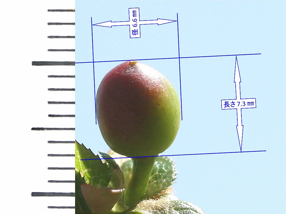 MEMO: 結実した冬桜の実の長さで、長さ 7.3 ㎜で、径は 6.6 ㎜と 丸い形で、春咲きの実で卵形で茶色が付き始めたところ