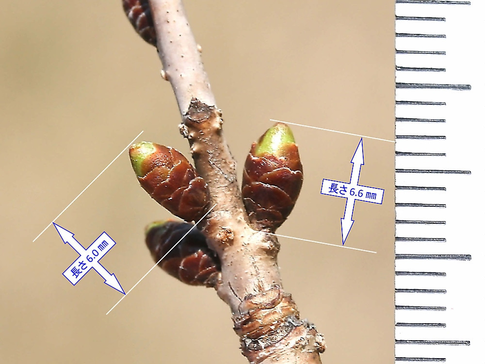 MEMO: 豆桜の冬芽で、長卵形で長さが 6.0~6.6 ㎜と長くなっており、 先端の淡黄緑色もはっきりしてきており、まもなくつぼみが出始める