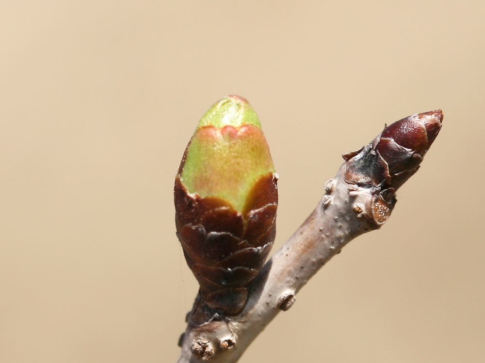 MEMO: 膨らみが最高潮に達した豆桜の冬芽で、丸々に なり、まもなく先端がわれ、つぼみが出てくると思われる