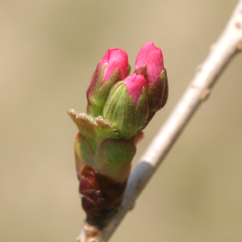 MEMO: 1個の冬芽(花芽)から2~3個のつぼみが出始めたところで、 豆桜のつぼみの花弁は濃い紅色をしているのが特徴である