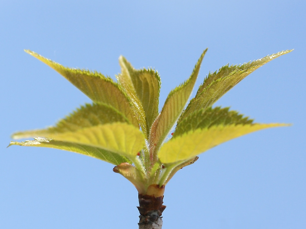 MEMO: 葉が出始めた豆桜で、満開時期を過ぎた頃から、 茶色がかった黄緑色の若葉が出始める