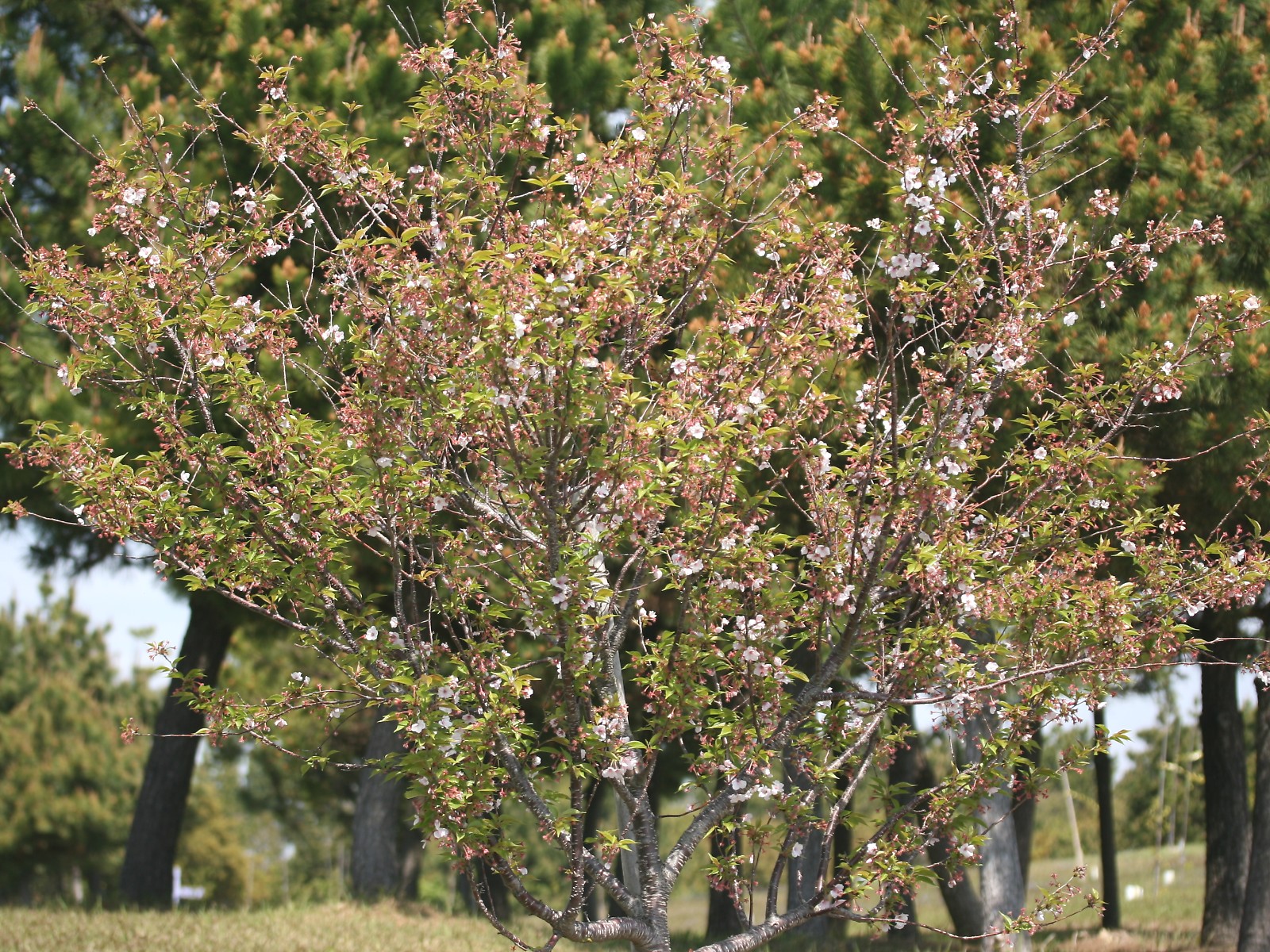 MEMO: 花時期が終了した豆桜で、葉も出始めており、 残り花が少し見受けられるが、今年の花の時期は終了した