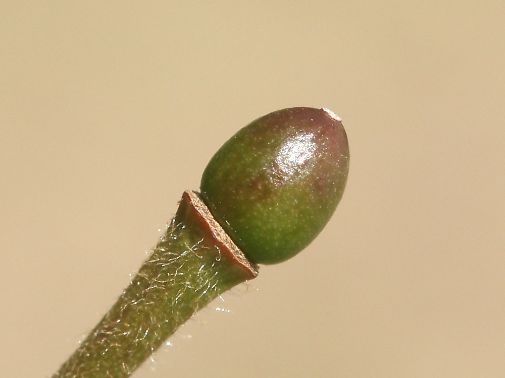 MEMO: 結実したばかりの豆桜の実で、褐色がかった緑色で卵形で、 まだ小さいが、この先成長し、黒熟していく