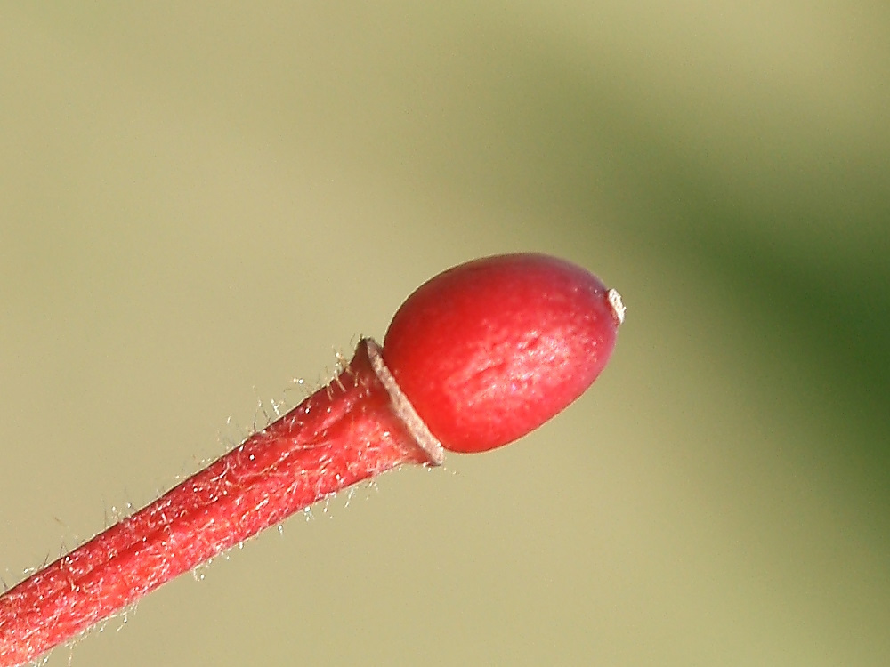 MEMO: 結実した豆桜の最後の実で、こんなに小さいのにもう赤く なっており、熟していると思われ、おそらく、この後、この実は落果 してしまい、豆桜の実は大きくなる前に全て落果してしまうと思われる