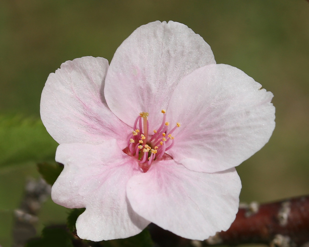 MEMO: 豆桜の遅れ花で、もう実も落果し、完全に葉桜となっているが、 2輪だけ遅れ花が咲いており、豆桜の花の終り頃の花姿をしている