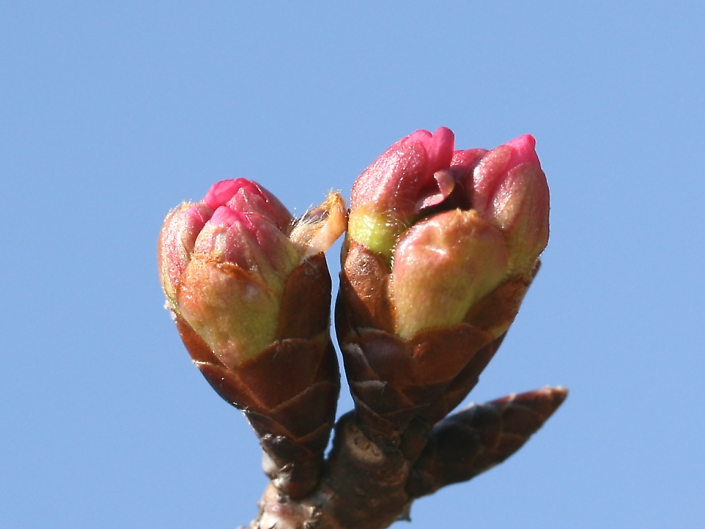 MEMO: 1個の冬芽(花芽)から3~4個のつぼみが出始めている雅の 冬芽で、つぼみの出始めから濃紅色の花弁が顔を出し始めているところ