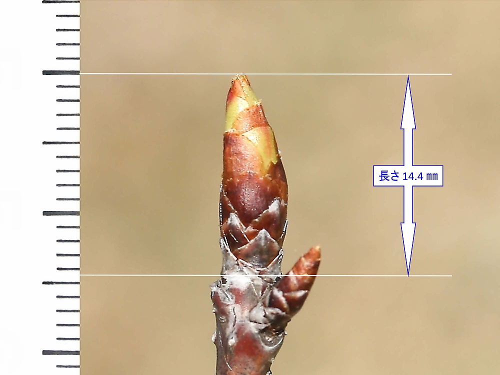 MEMO: 八重桜の冬芽で、長卵形で、長さ 14.4 ㎜と非常に 長くなり、先端の淡紅色や淡黄緑色の部分も伸びてきたところ