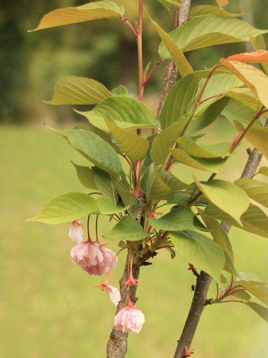MEMO: 散り始め時期を迎えた八重桜で、花が赤みを 帯びてきており、散り始めが近づいた状態である